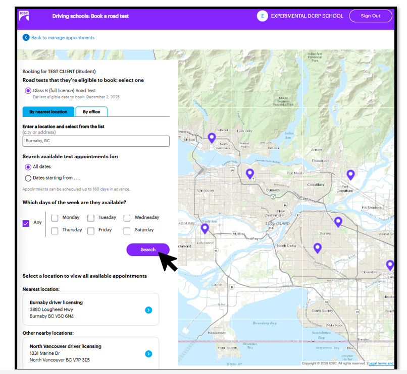 Follow the prompts on screen by choosing the road test type, ICBC road test location, and student availability. When finished, select Search.