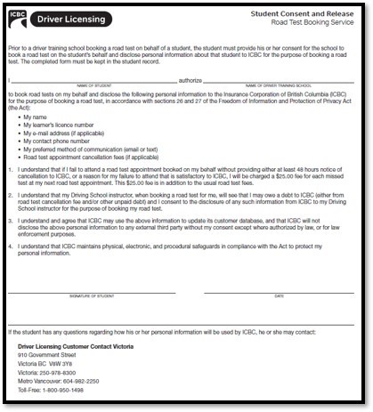 Before booking a road test for a learner, you will need to have the student fill and sign the Student Consent and Release form, then insert it into their records. To obtain fresh copies of this form, visit: Road Test Booking Service Student Consent.