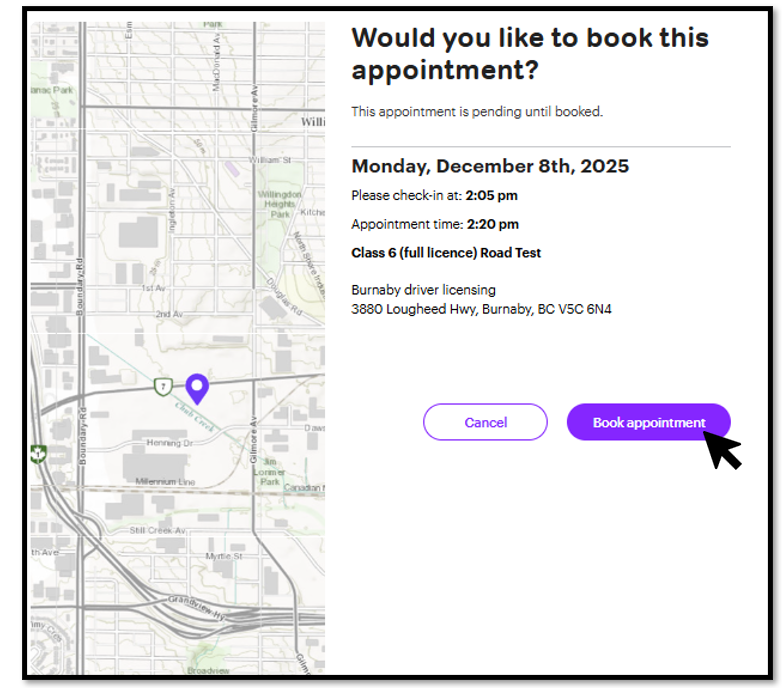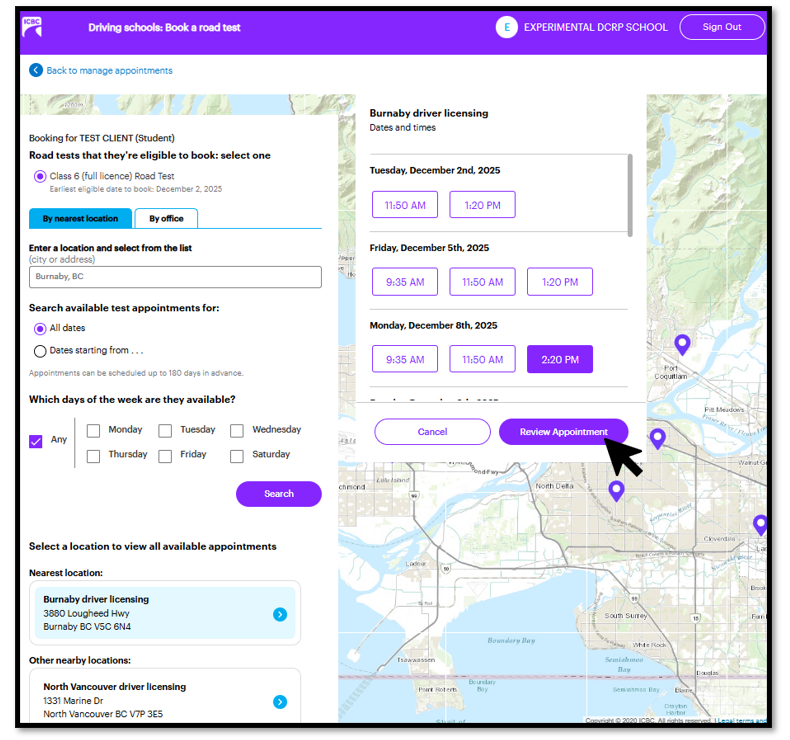 After completing the steps above, you will see available road-testing spots to choose from. Road tests may be booked up to 6 months in advance. Once you’ve selected a day and time, select Review Appointment.