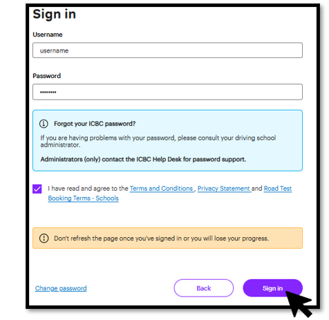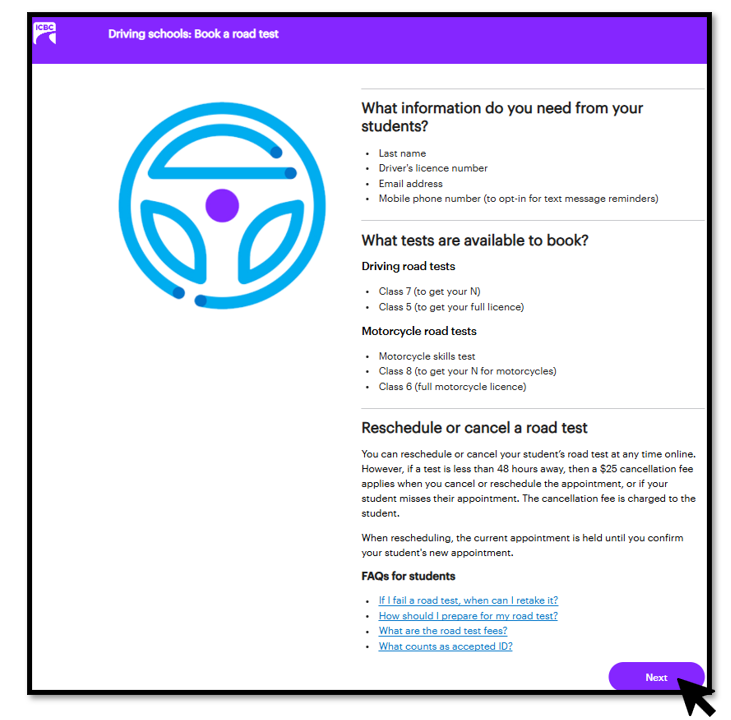 If you book road tests on behalf of your driver training students, continue to use the Road Test Booking Service (for driver training schools) for all bookings. As a reminder, never ask your student to provide their security keyword. This keyword is personal information.