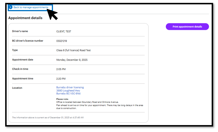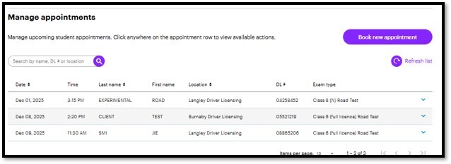 You should now see the newly booked appointment on your school’s road test schedule. From here, you can change or cancel existing appointments; or book another road test.