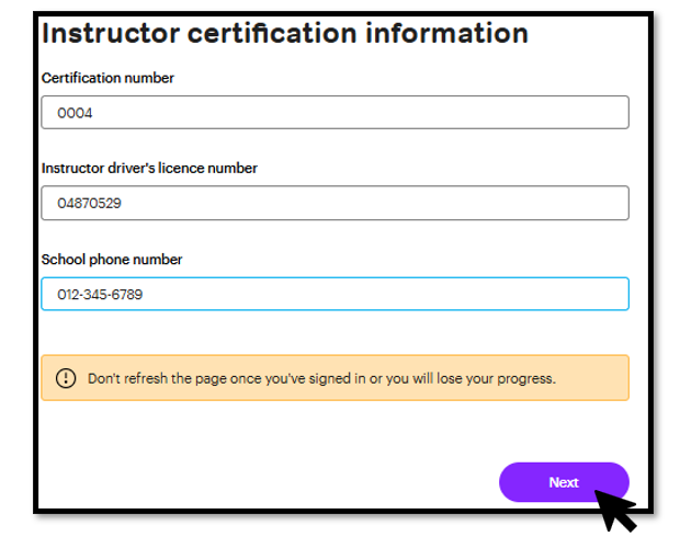 Enter your school’s Certification#, Instructor DL# and School Phone#, then select Next.