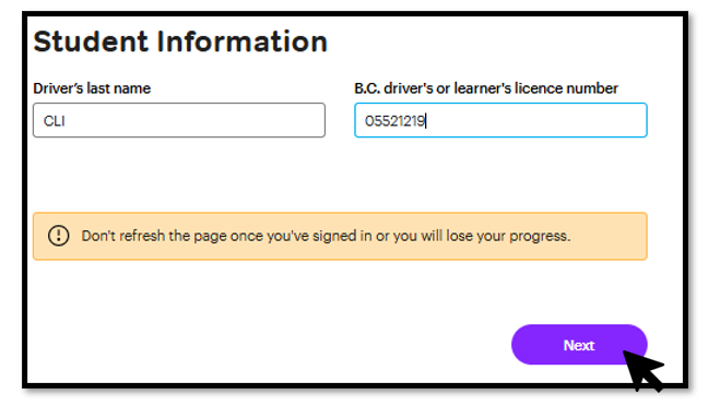 Once prompted, enter the last name of the student followed by their DL#; then select Next.