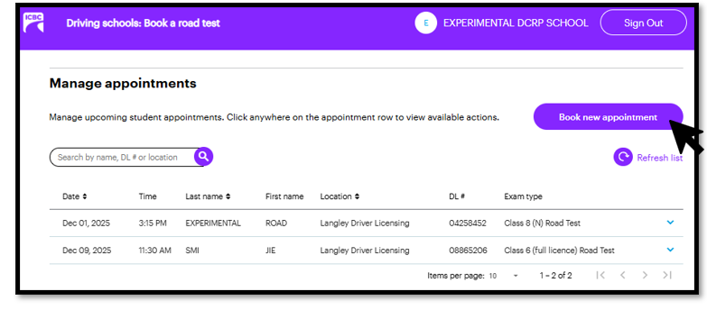 After completing the initial sign-in steps, you will be brought to your school’s “Manage appointments” page. From here, you are able to cancel, change and/or book appointments. Click Book new appointment to continue with booking a road test for your student.